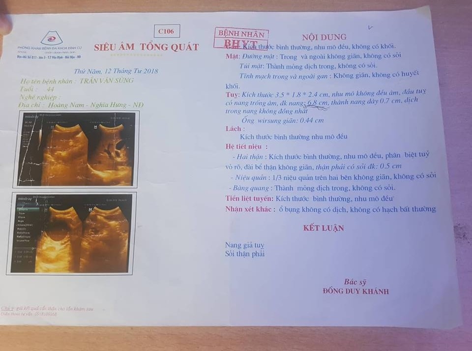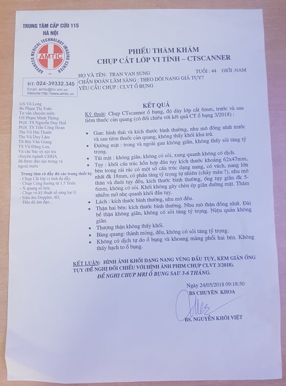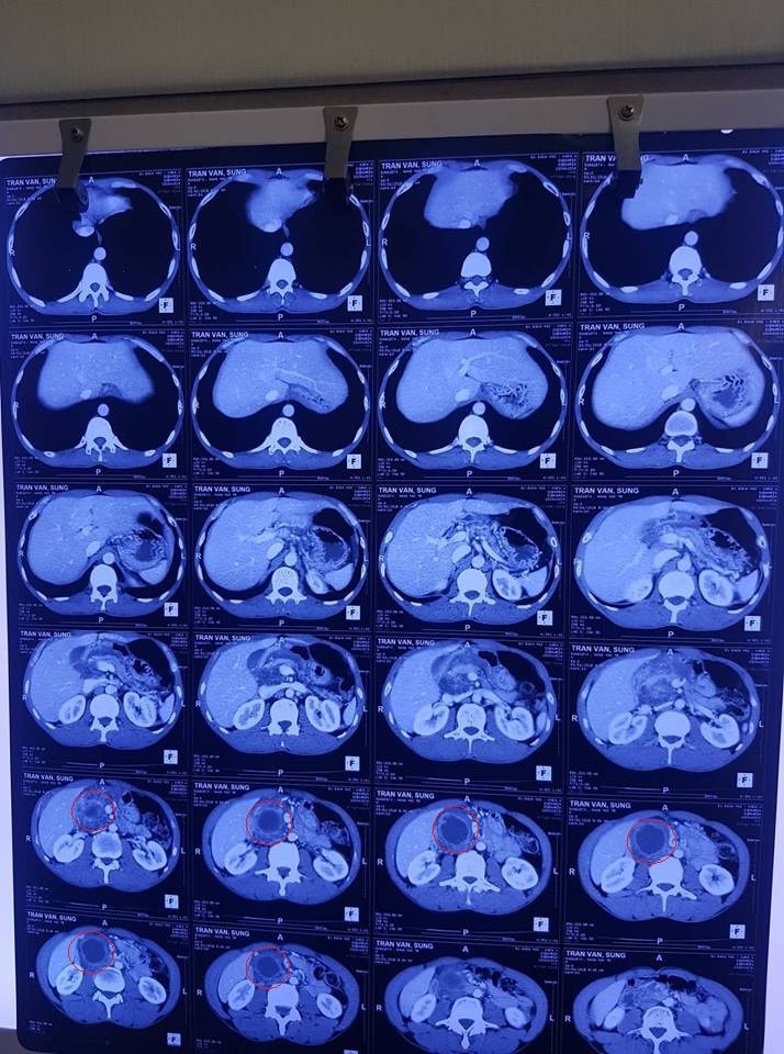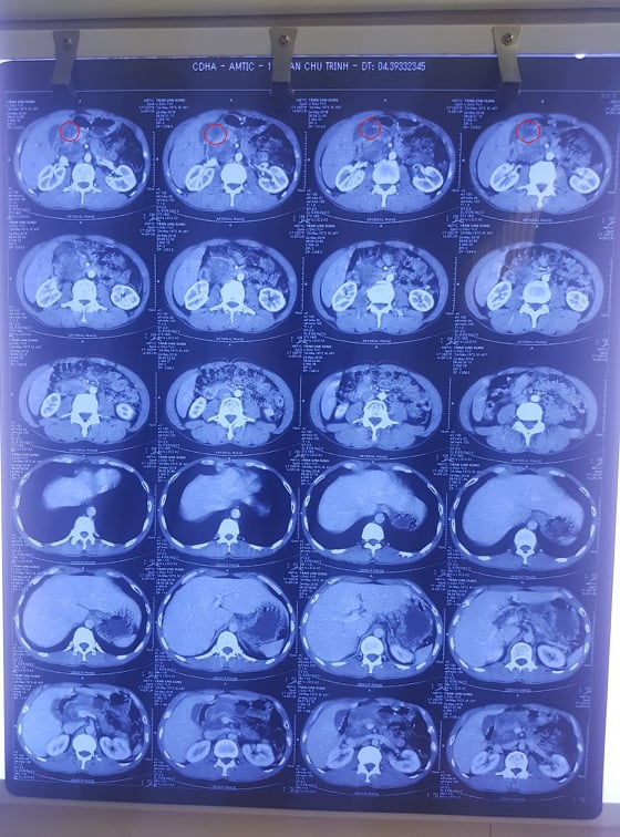 Chụp CT: Tổn thương U vùng đầu tụy dạng đa nang, nang lớn nhất KT 4,5×4,3cm.