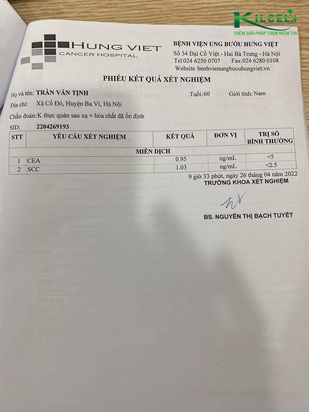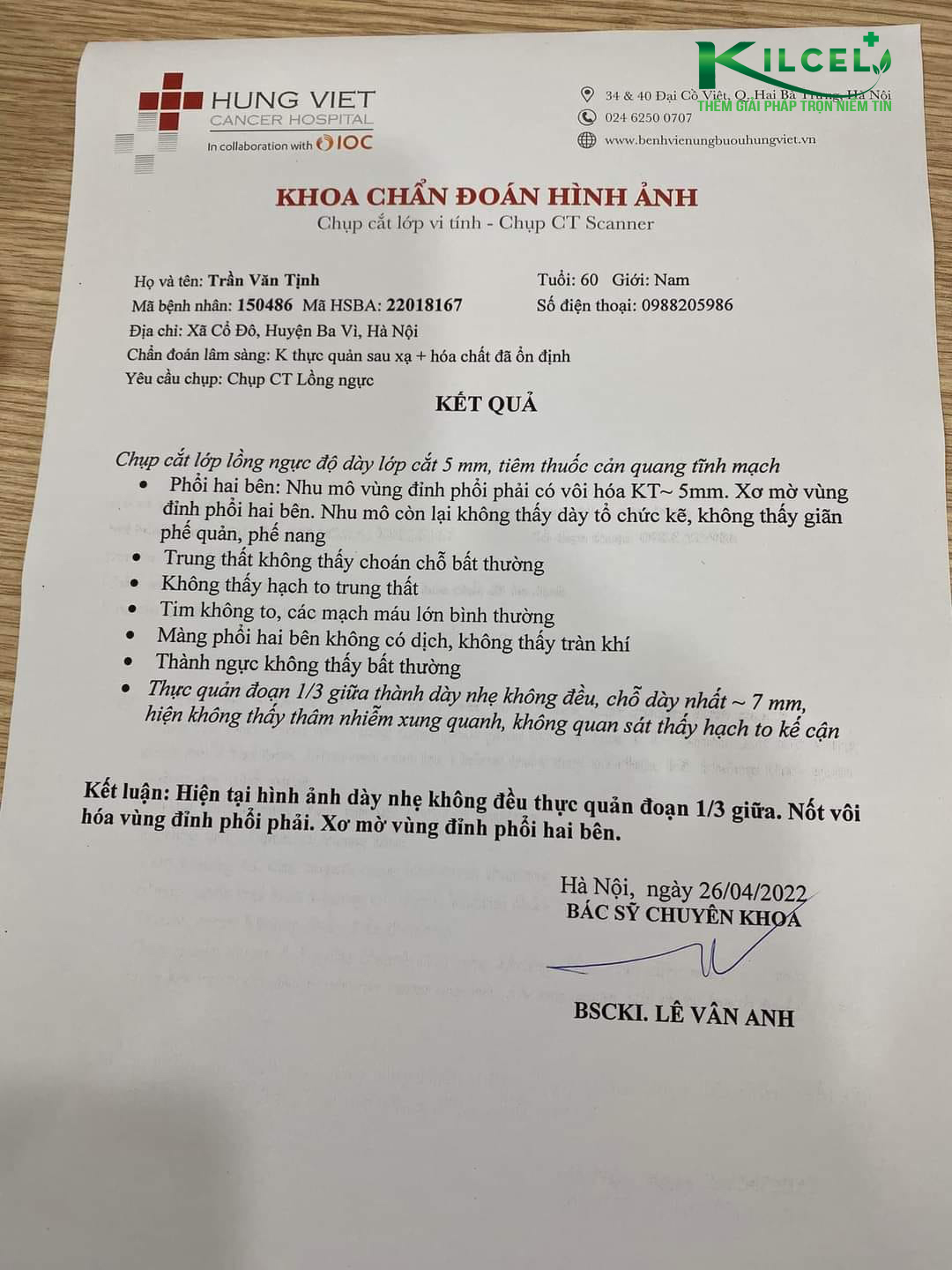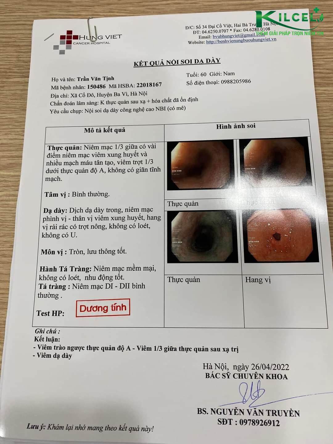 Anh bị Ung thư Thực quản đã xạ + hoá chất, bệnh đáp ứng một phần, sau xạ và hoá chất anh vẫn nuốt nghẹn, tức vùng ngực, anh tiếp tục uống Kilcel hơn 1 năm, sau 03 tháng khám lại 1 lần, đến lần khám lại thứ 4 thành thực quản không còn tổn thương , nuốt bình thường, không còn đau, tăng hơn 10 kg.