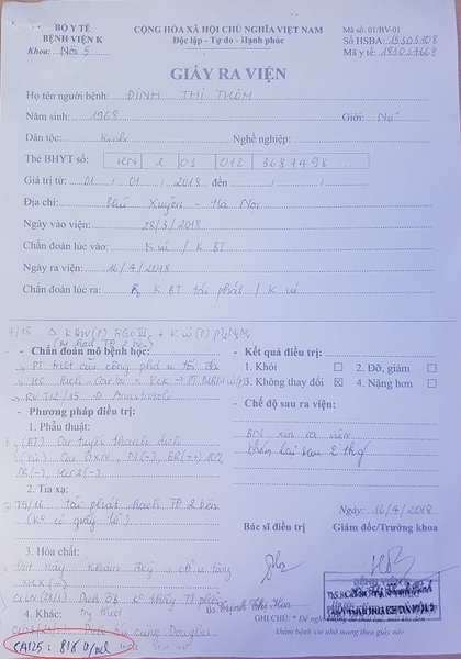 - Phát hiện K vú phải năm 2015. Giải phẫu bệnh: Ung thư vú thể ống xâm nhập. Đã phẫu thuật và hóa chất.
