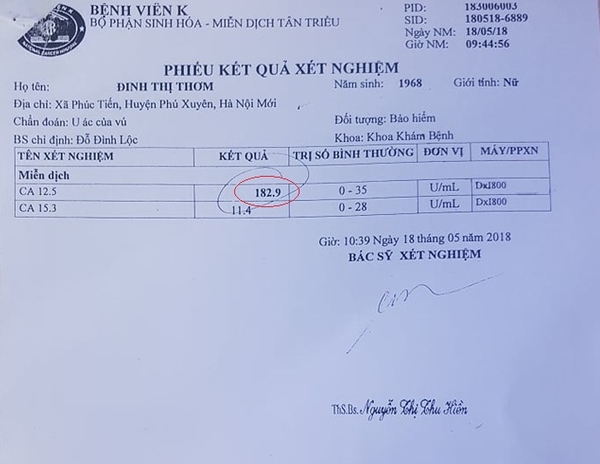- Tháng 4/2018 BN uống KILCEL 500mg một tháng với liều 15 viên/ngày sau đó xét nghiệm lại. Kết quả CA125: 182,9 U/ml.